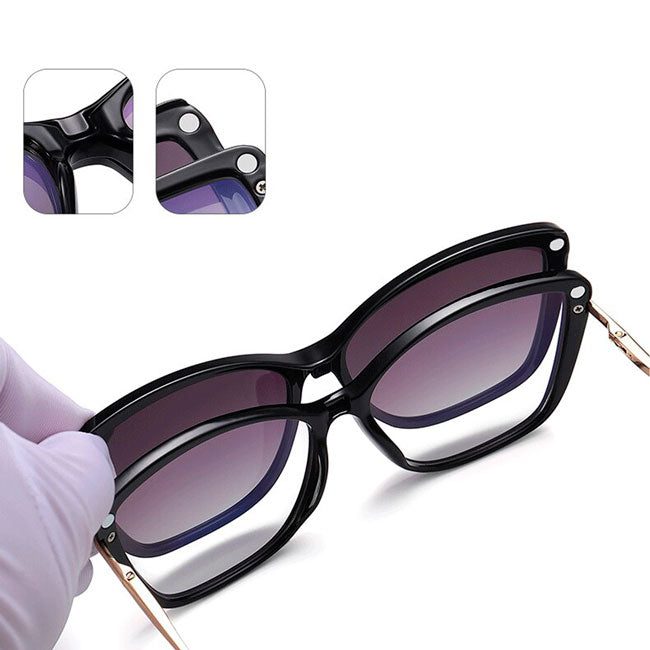 Lentes con clip solar imantado, gafas para mujer que Incluye 1 sobre lentes imantados intercambiables color. El sobrelente tiene UV400 y además es polarizado.