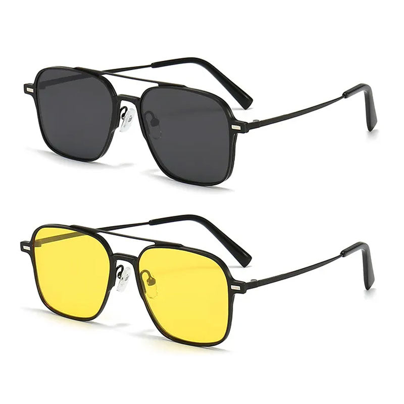 Clip On Duo es modelo exclusivo en titanio laminado que incluye 2 clip solares, negro polarizado y filtro amarillo. Tiene un diseño moderno y apto para cualquier tipo de graduación.