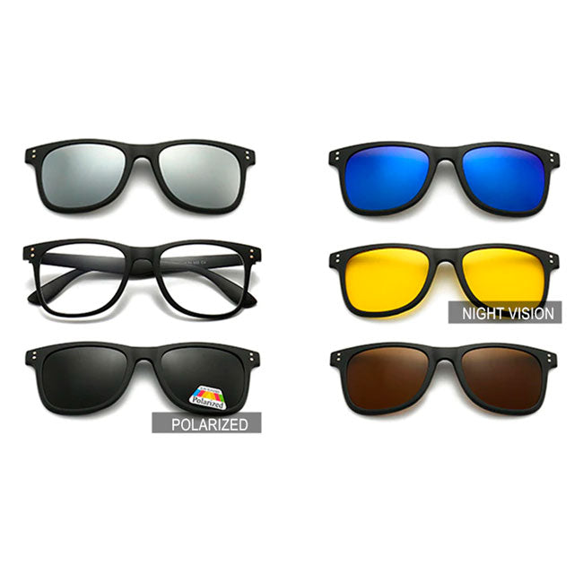 Lentes con clip solar imantado, fabricadas en TR90. Incluye 5 sobre lentes imantados intercambiables, color negro polarizado, azul, plateado, marrón y filtro amarillo.